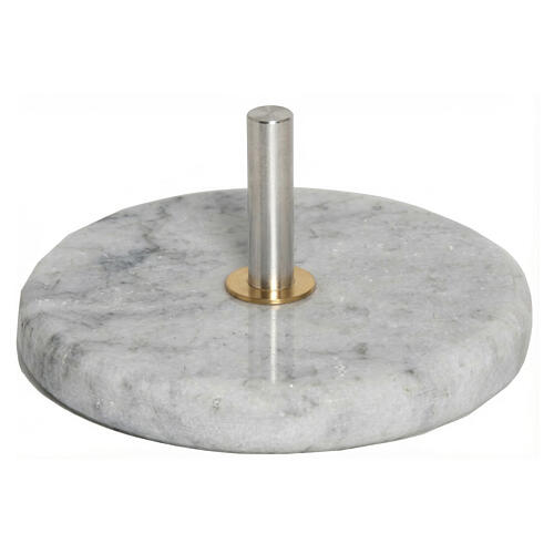 Base astile in marmo di Carrara con struttura circolare monolitica e perno centrale metallico per innesto asta.