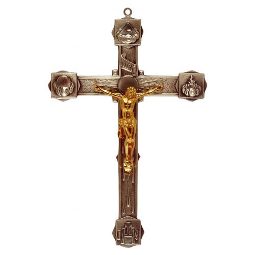 La croce superiore presenta formelle in rilievo con simbologia trinitaria, cartiglio INRI sommitale e raggiera incisa centrale con applicazione del Cristo.