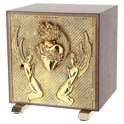 Tabernacolo con anta frontale blindata in fusione di ottone decorata con simbolo del Sacro Cuore di Gesù in rilievo centrale e figure laterali in preghiera.