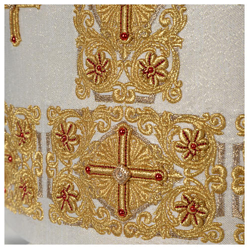 Mitra in tessuto con filo dorato, riccamente ricamato e decorato con pietre applicate a mano e frange.