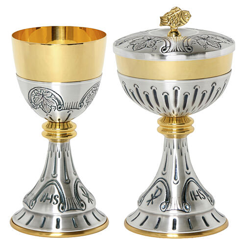 Set composto da calice e pisside, realizzati in Italia in ottone argentato con eleganti inserti in ottone dorato, pensati per creare un contrasto raffinato e armonioso. La base, finemente cesellata, presenta piccoli motivi lineari che donano movimento e luminosità. Sul gambo, la lavorazione prosegue con una serie di puntinature cesellate che sfumano verso l'alto e vengono riprese anche nella coppa del calice.