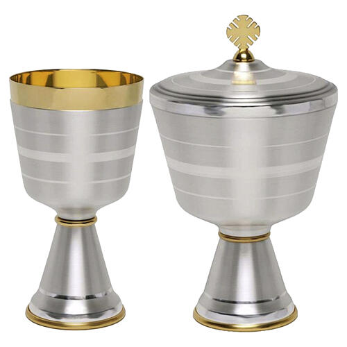 Set di calice e pisside in ottone argentato, caratterizzato da una linea moderna e semplice. La base di entrambi i pezzi è arricchita da un sottile bordo dorato, che crea un contrasto delicato tra i due articoli.
