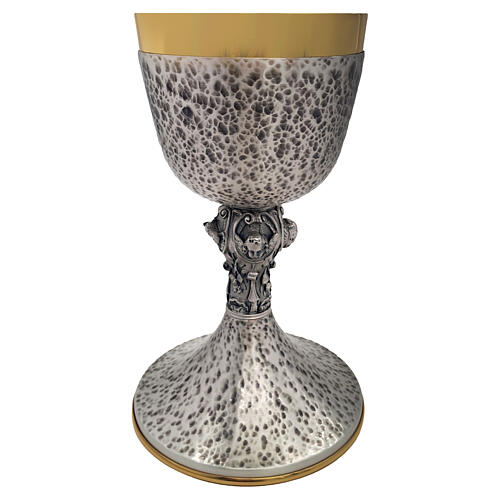 Questo calice è stato realizzato in Italia con una lavorazione curata nei dettagli. Il piede e la coppa presentano una finitura argentata puntinata, che crea un elegante contrasto con le parti dorate. Il nodo centrale è decorato con i simboli dei quattro evangelisti, accuratamente modellati e ben visibili, dettaglio che arricchisce il calice di un forte valore simbolico.