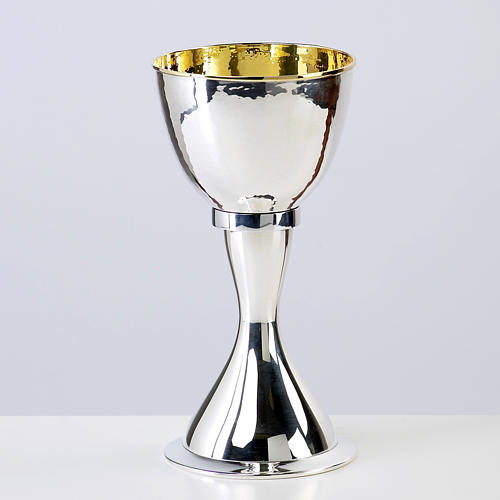Calice da messa realizzato in metallo argentato con coppa placcata oro all'interno e nodo in alluminio lucido a specchio. Il fusto del calice è lucido, la coppa è invece battuta a mano.