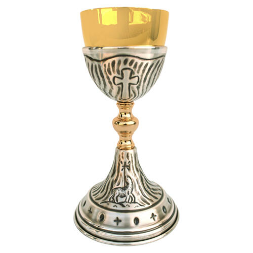 Set calice e pisside cesellati con croce e Agnello di Dio