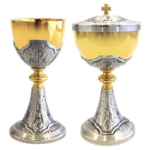Set liturgico composto da calice e pisside in metallo con finitura argentata e dettagli dorati. Entrambi i pezzi sono cesellati con i simboli cristologici JHS e PX e presentano una raffinata lavorazione a fondo martellato.