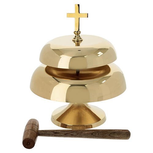 Il corpo è composto da doppia cupola con finitura lucida montata su base circolare stabile, completato da croce apicale e martello in legno massello con impugnatura cilindrica per battitura manuale.