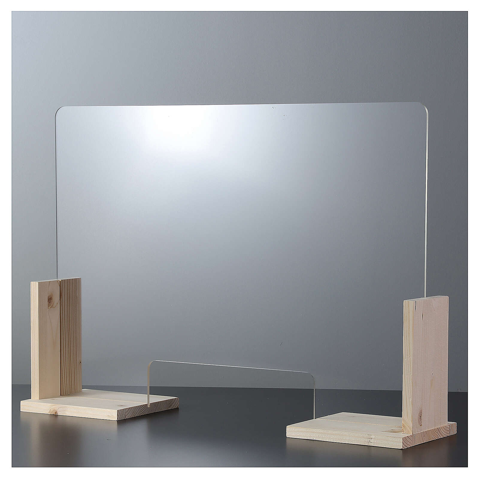 Pannello in plexiglass con piedini in legno che hanno ingombro totale 20 cm (10 cm per lato). Autoportante e facile da installare. Raggiature angolari.
