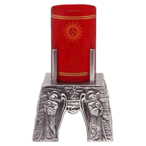 Questa base per lampada per il Santissimo è stata realizzata in ottone argentato, realizzata in Italia con una lavorazione ricca di dettagli. La base è quadrata e misura 13x13 cm, decorata sui lati con angeli scolpiti in rilievo e una fiamma centrale, simbolo di luce e presenza divina. La base superiore è progettata per un bicchiere porta cero da 8 cm.