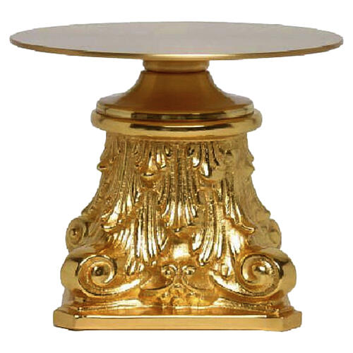 Tronetto per ostensorio in ottone dorato lucido, caratterizzato da una base leggermente quadrata e impreziosito da un decoro in stile barocco. Il piano superiore, dal diametro di 12 cm, offre un appoggio stabile per l'ostensorio, risultando ideale sia per l'altare maggiore sia per le piccole cappelle o spazi liturgici raccolti. Lo stile brocco permette di abbinarlo facilmente ad altri arredi con decorazioni simili.