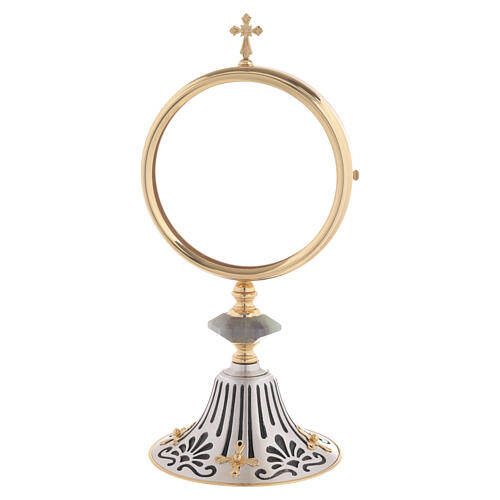 Ostensorio artigianale Made in Italy, caratterizzato da una base decorata con ghirigori floreali neri e piccole croci in rilievo.