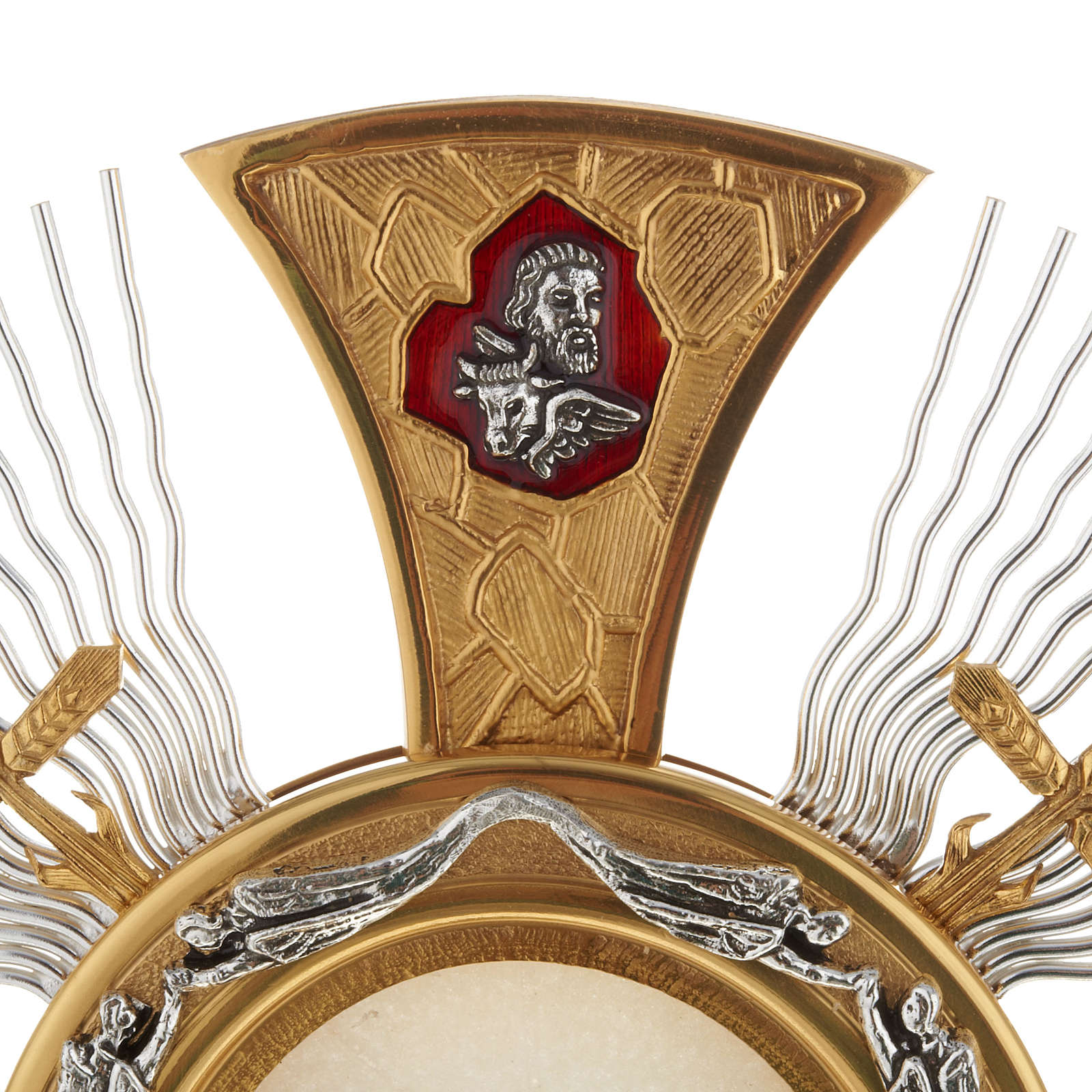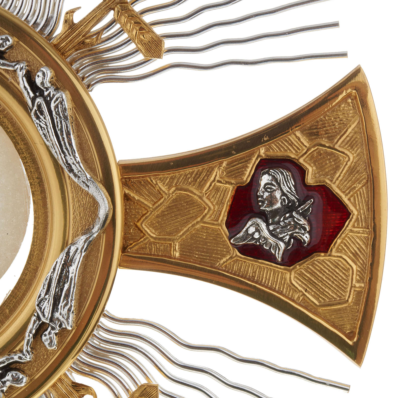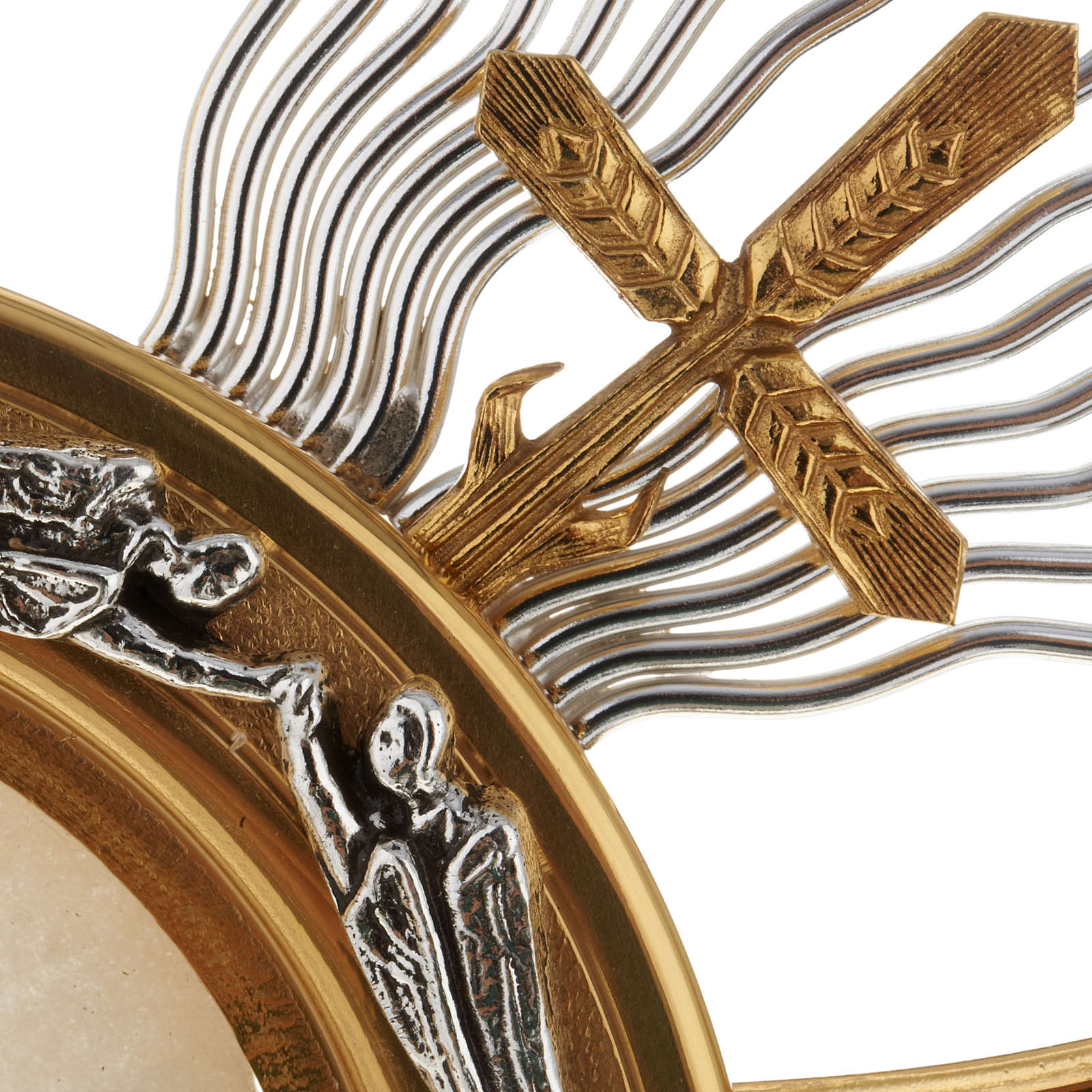 Ostensorio in bronzo argentato e dorato finemente decorato con raggiera arricchita di croci che incorniciano la teca del Santissimo.