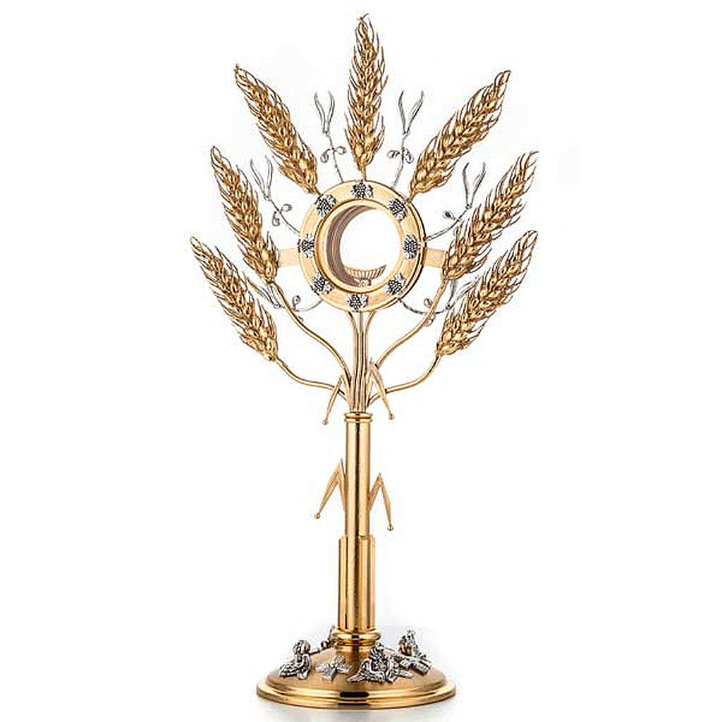 Ostensorio in bronzo argentato e dorato, finemente lavorato con inserti argentati di grappoli di uva, spighe dorate che come raggi si propagano dalla teca, sulla base sono presenti i simboli dei quattro evangelisti.