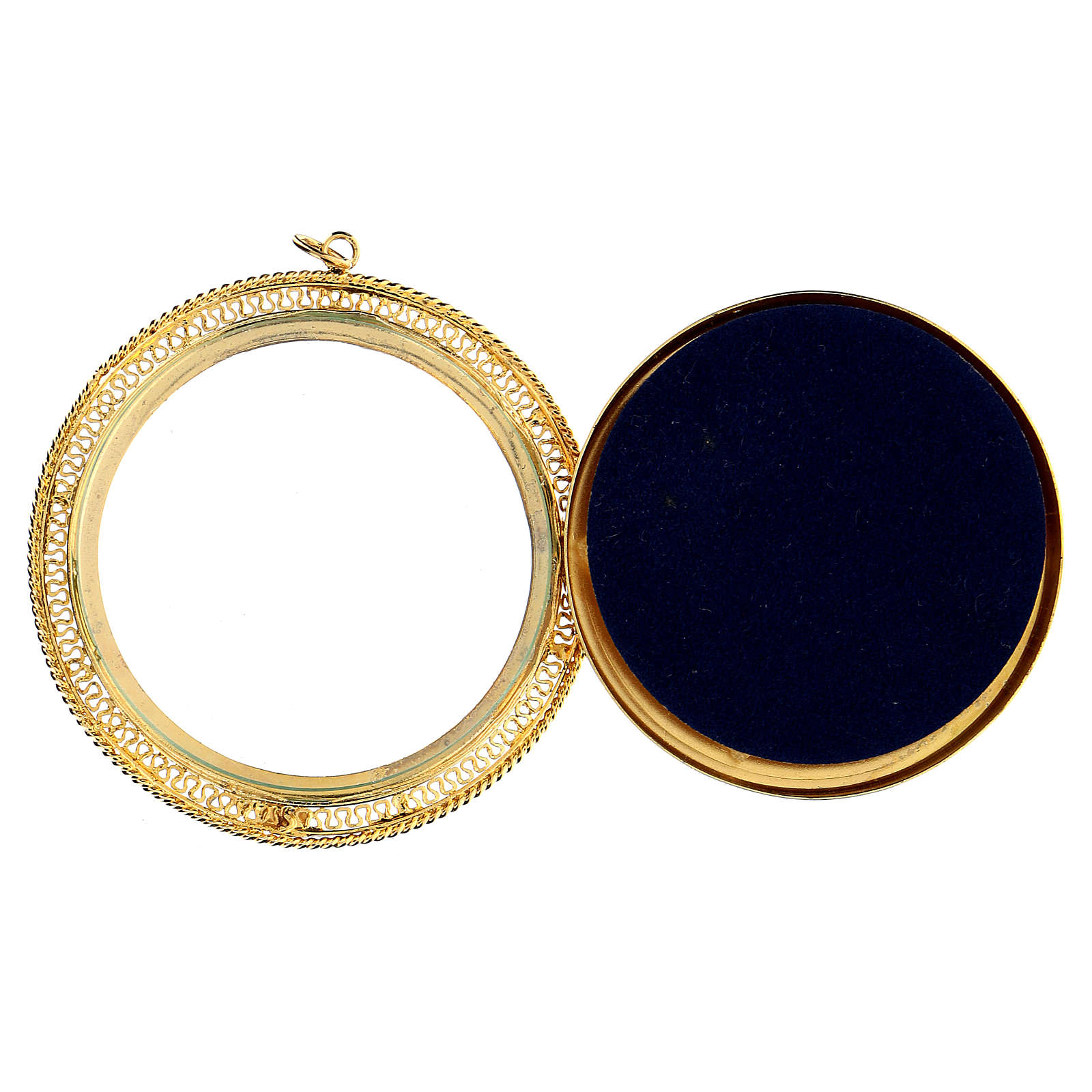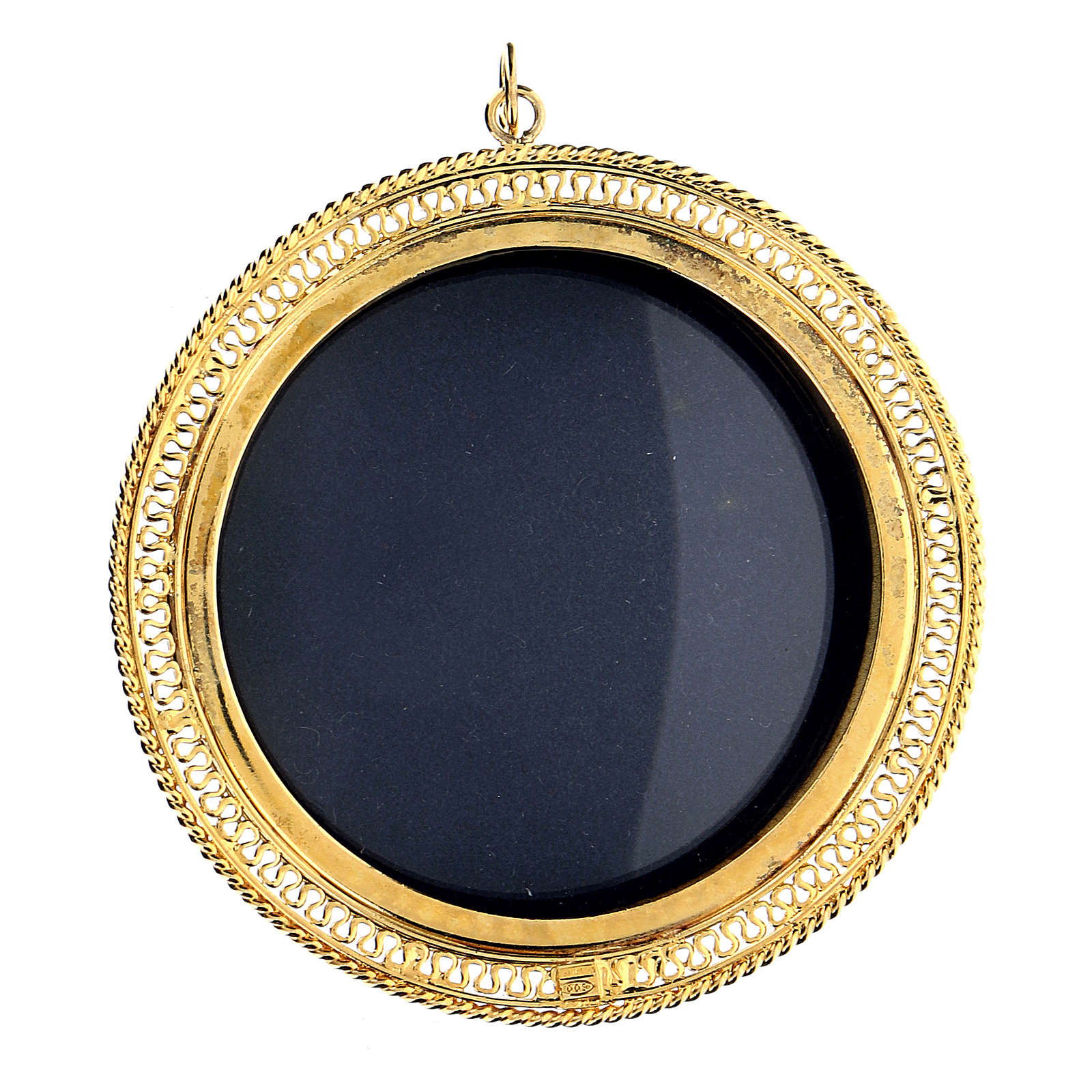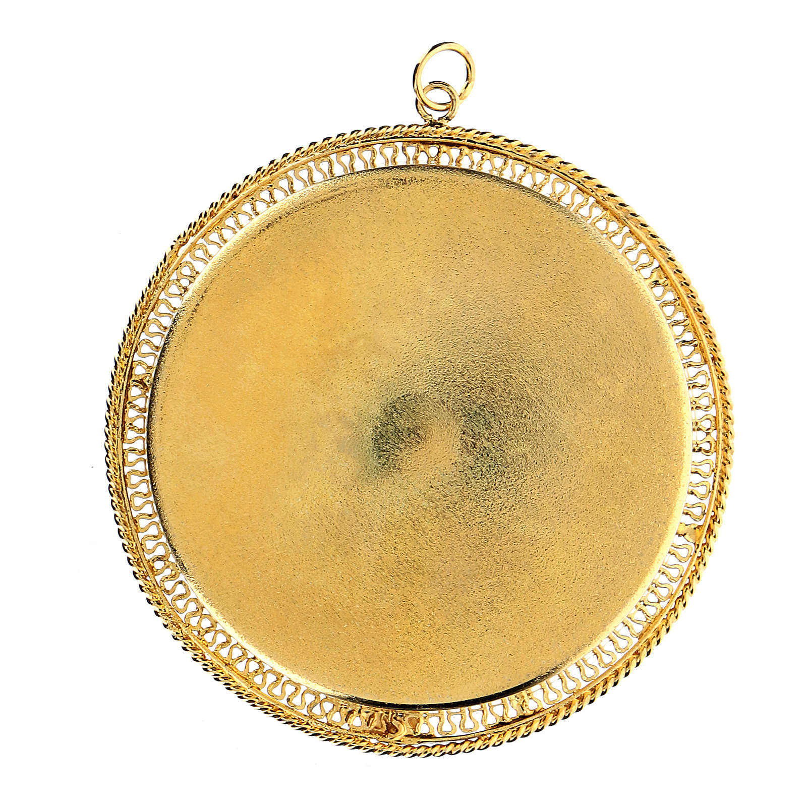 Reliquario dorato tondo 6 cm in argento 925 con filigrana.