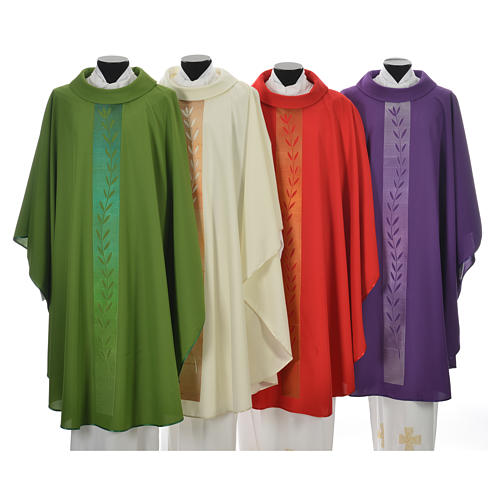 Casula 100% in poliestere con ricamo di ramo d'ulivo su fascione. Disponibile nei 4 colori liturgici.