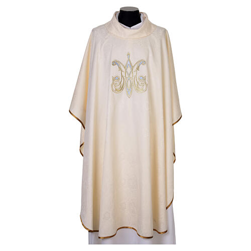 Il contrasto tra il tessuto avorio damascato e il ricamo celeste conferisce al paramento una particolare distinzione, ideale per le celebrazioni Mariane.