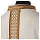 Questa casula è realizzata in pura lana, dalla sensazione di leggerezza. È caratterizzata da un delicato collo incrociato con decori dorati, e da stoloni intrecciati a mano, che uniscono la passamaneria dorata a nastri in due tonalità di velluto.
