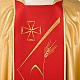 La casula è realizzata in tessuto poliestere di colore dorato, lo stolone è rosso con croci e decori stilizzati dorati, con uva e spighe sia sul fronte che nel retro.