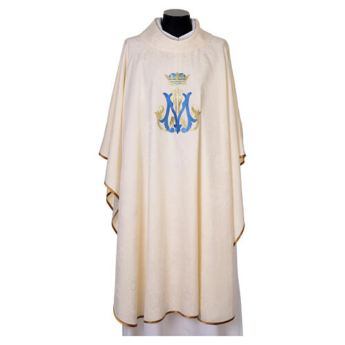 Il paramento si distingue per l'ampio e ricco ricamo Mariano, eseguito in una combinazione di filo blu brillante e dettagli in oro. Il monogramma è sormontato da una corona dorata, enfatizzando il titolo di Regina.