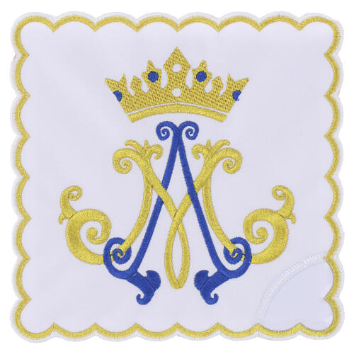 Palla copricalice mariana con iniziale stilizzata e corona ricamate in filo oro su tessuto poliestere rigido 17x17 cm incluso cartoncino.