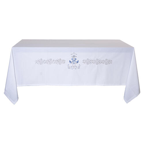 La tovaglia è realizzata in tessuto bianco. La decorazione si sviluppa lungo il bordo anteriore e centrale della tovaglia. L'elemento distintivo è il ricamo centrale che presenta il monogramma Mariano, sormontato da una corona, eseguito prevalentemente in filo celeste e argento.
