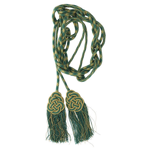 Cordone intrecciato verde e oro con due medaglioni decorativi annodati e terminali con frangia.