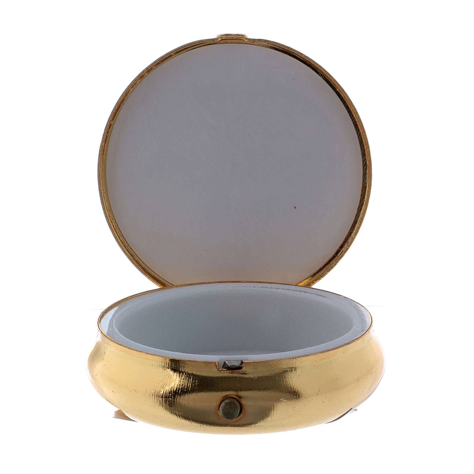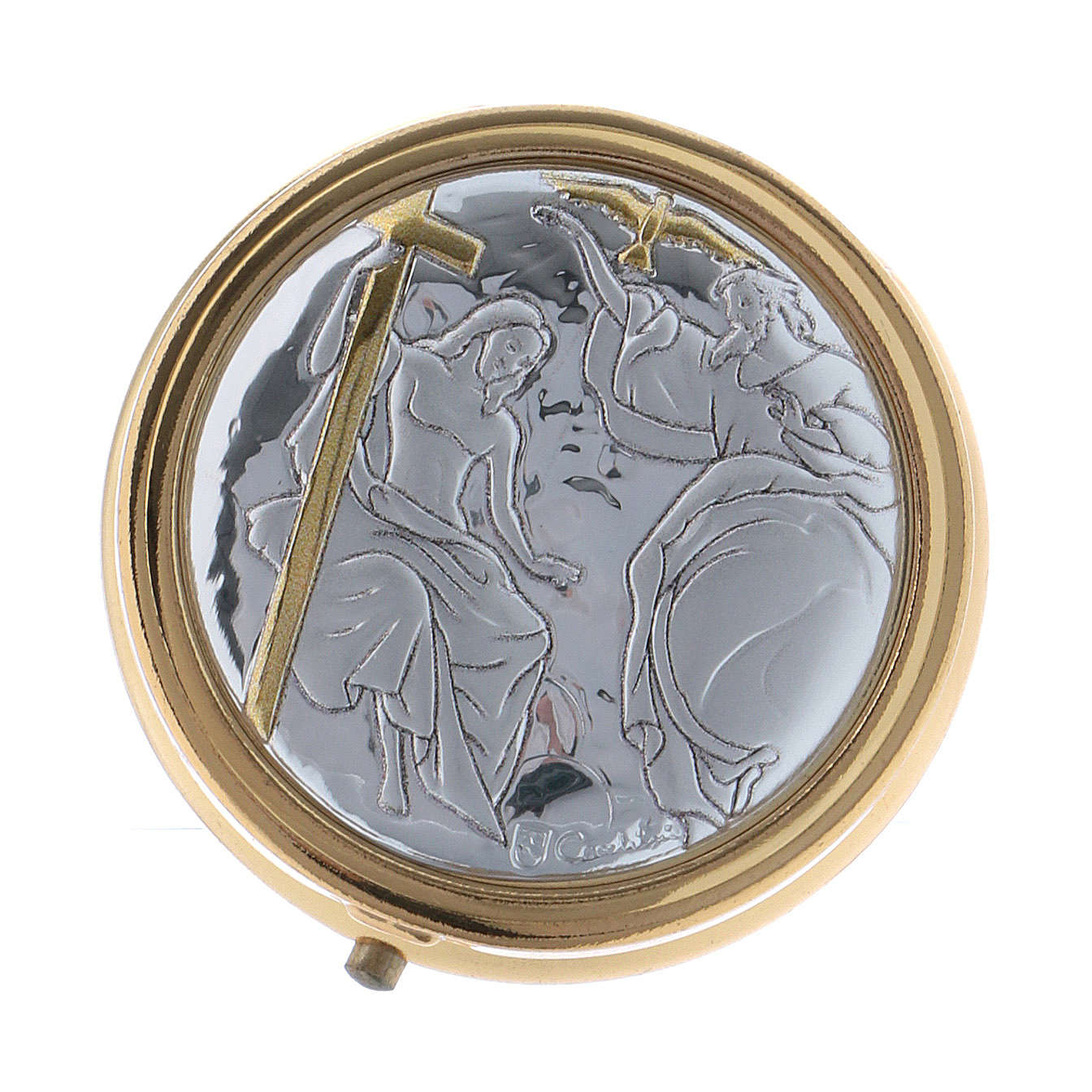 Disponibilità immediataPill box Trinità in metallo dorato con placca alluminio con oro colore.