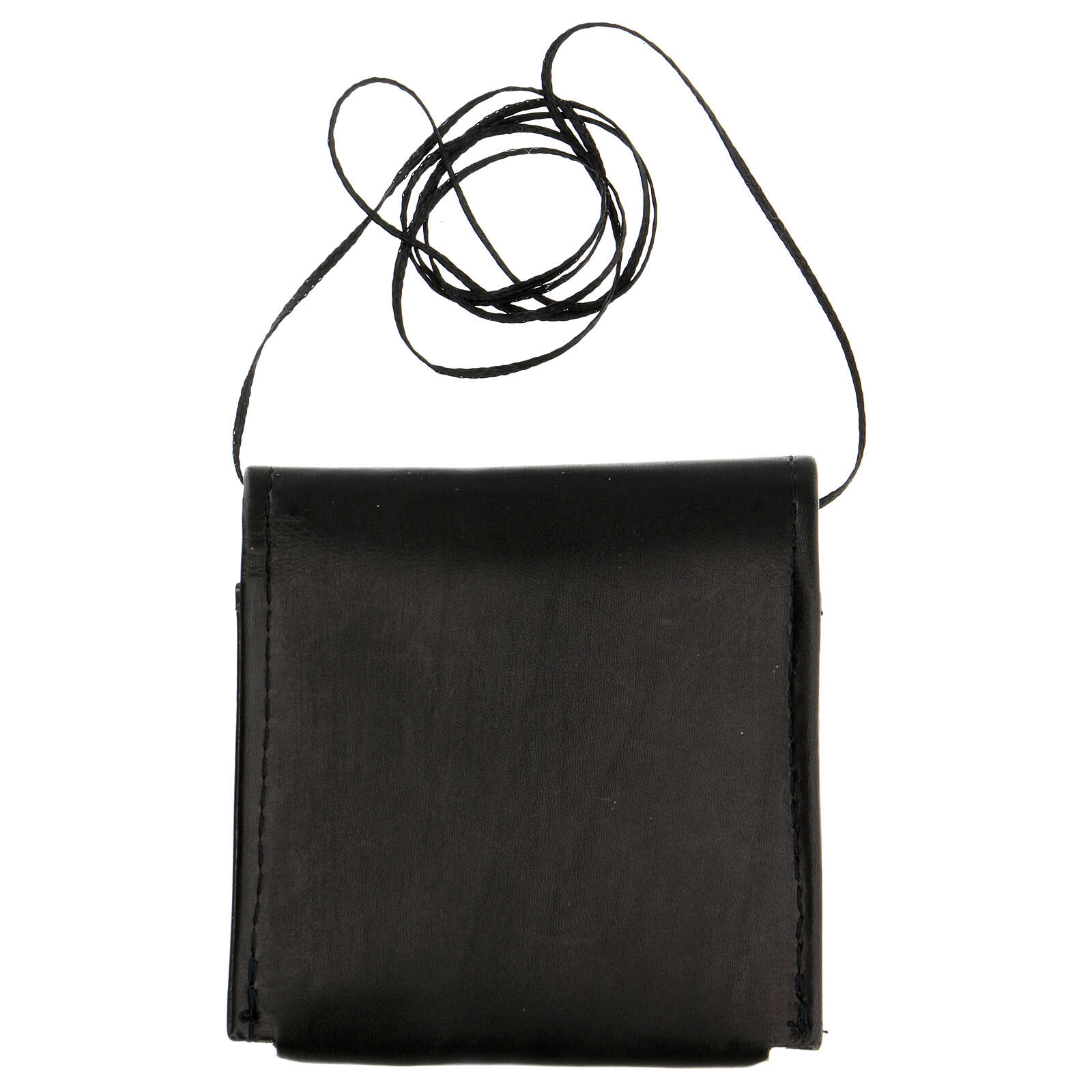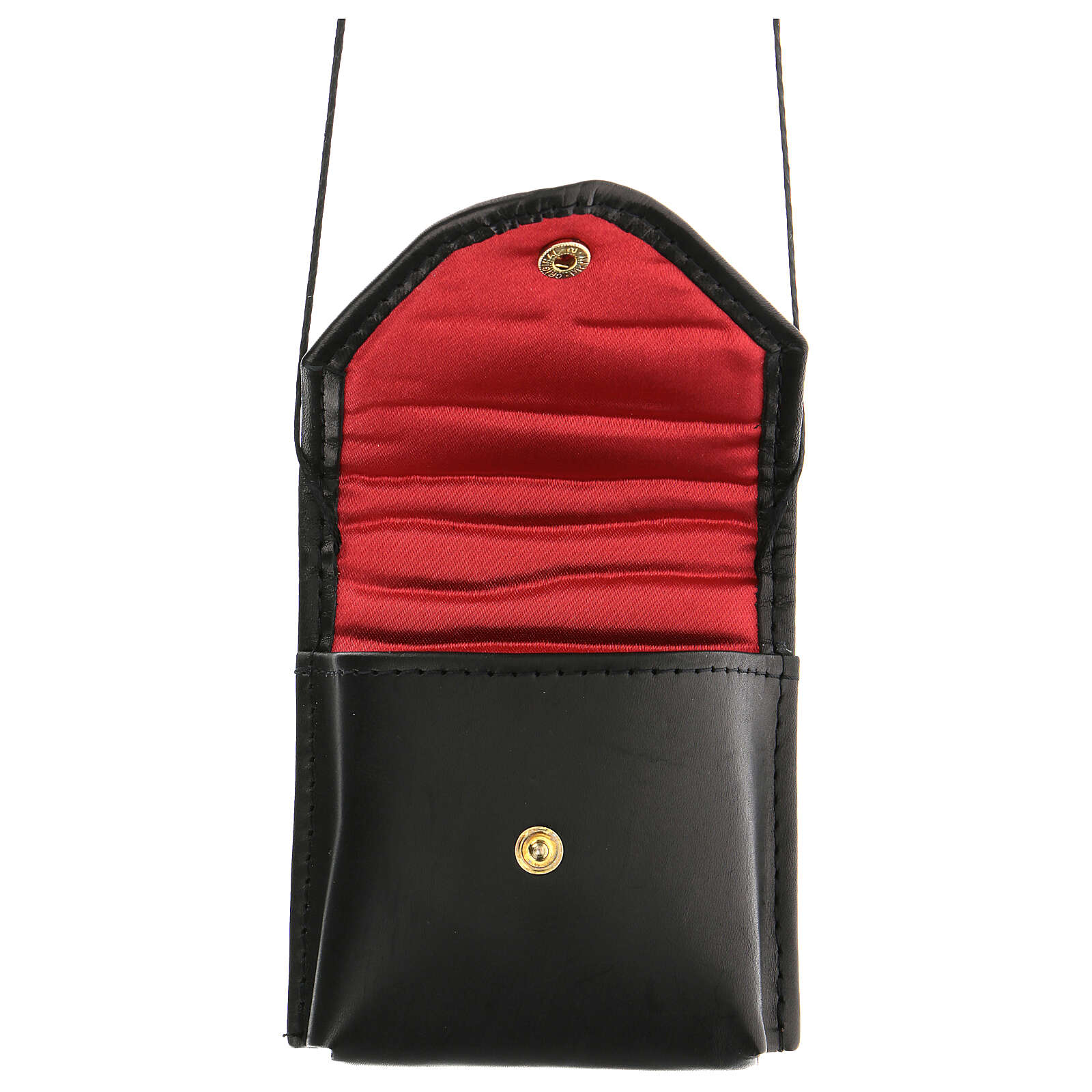 Piccolo astuccio per teca eucaristica in vera pelle di vitello morbida al tatto, con interno in fodera rossa e cordicella da portare al collo,