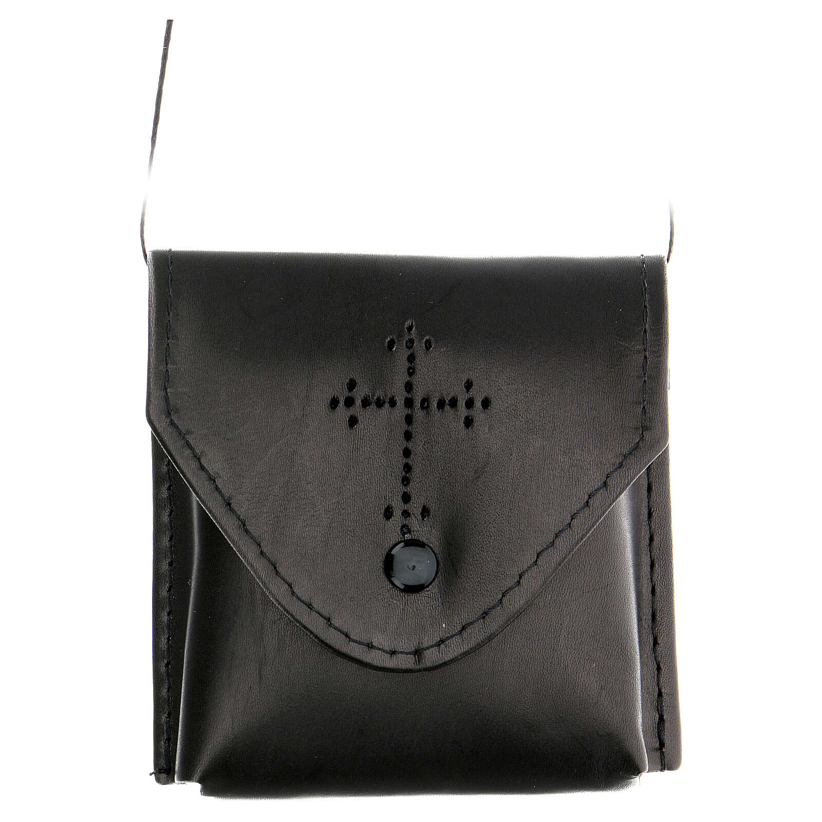 La croce è impressa a caldo con punzone traforato, la pelle è di colore nero con raso rosso all'interno.