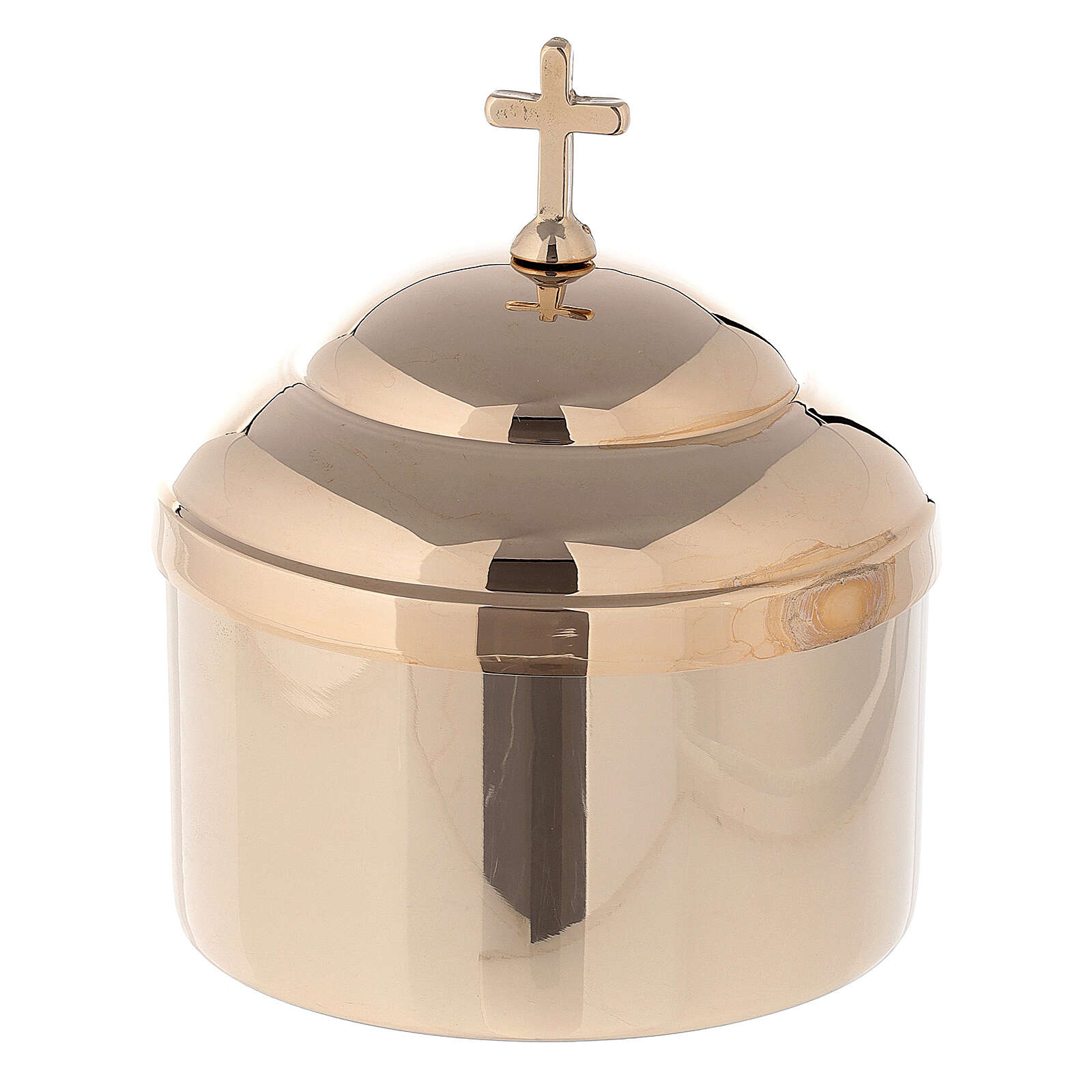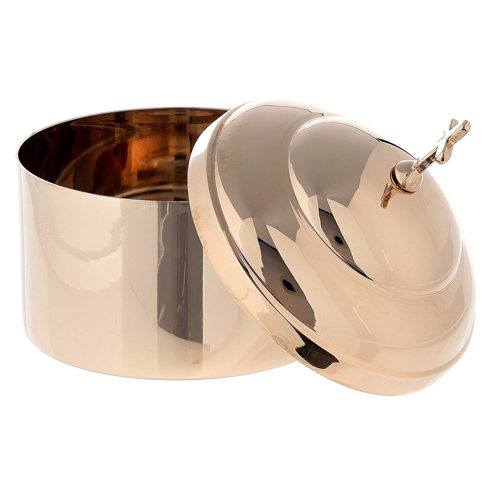 Disponibilità immediataScatola portaostie in ottone dorato lucido con coperchio e presa a croce per circa 30 ostie.