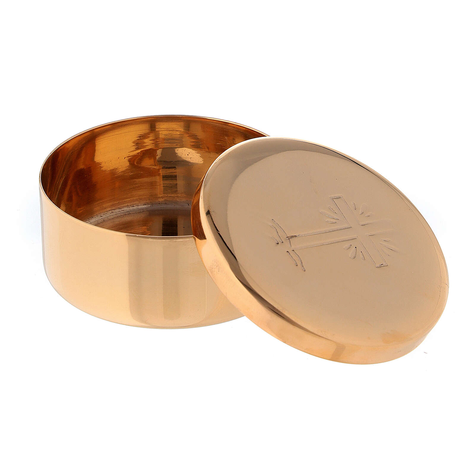 Questa teca per ostie è realizzata in ottone dorato ed è caratterizzata da un decoro inciso a foggia di croce latina da cui partono raggi. Diametro 5 cm.