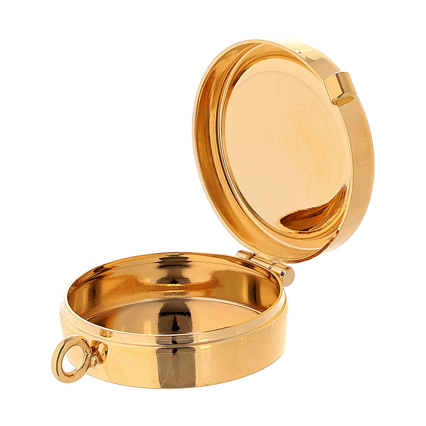 Questa piccola teca Eucaristica ha una base in ottone dorato 24k garantito e può contenere circa 4 particole di diametro massimo 4 cm. Presenta già un anello per catenina, in modo da poter essere portata al collo.