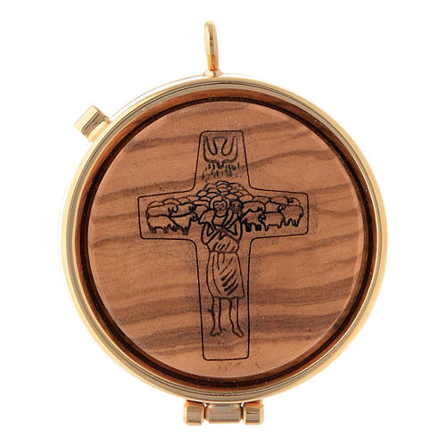 Teca eucaristica con placca in legno d'olivo, immagine della Croce del Buon Pastore, diam. 5 cm.