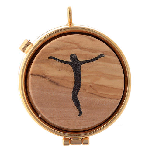 Teca eucaristica con placca in olivo, simbolo del Crocifisso stilizzato, diametro 5 cm.
