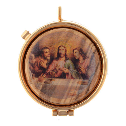 Teca eucaristica con placca in olivo di Assisi, e immagine dell'Ultima Cena, diametro 5 cm.