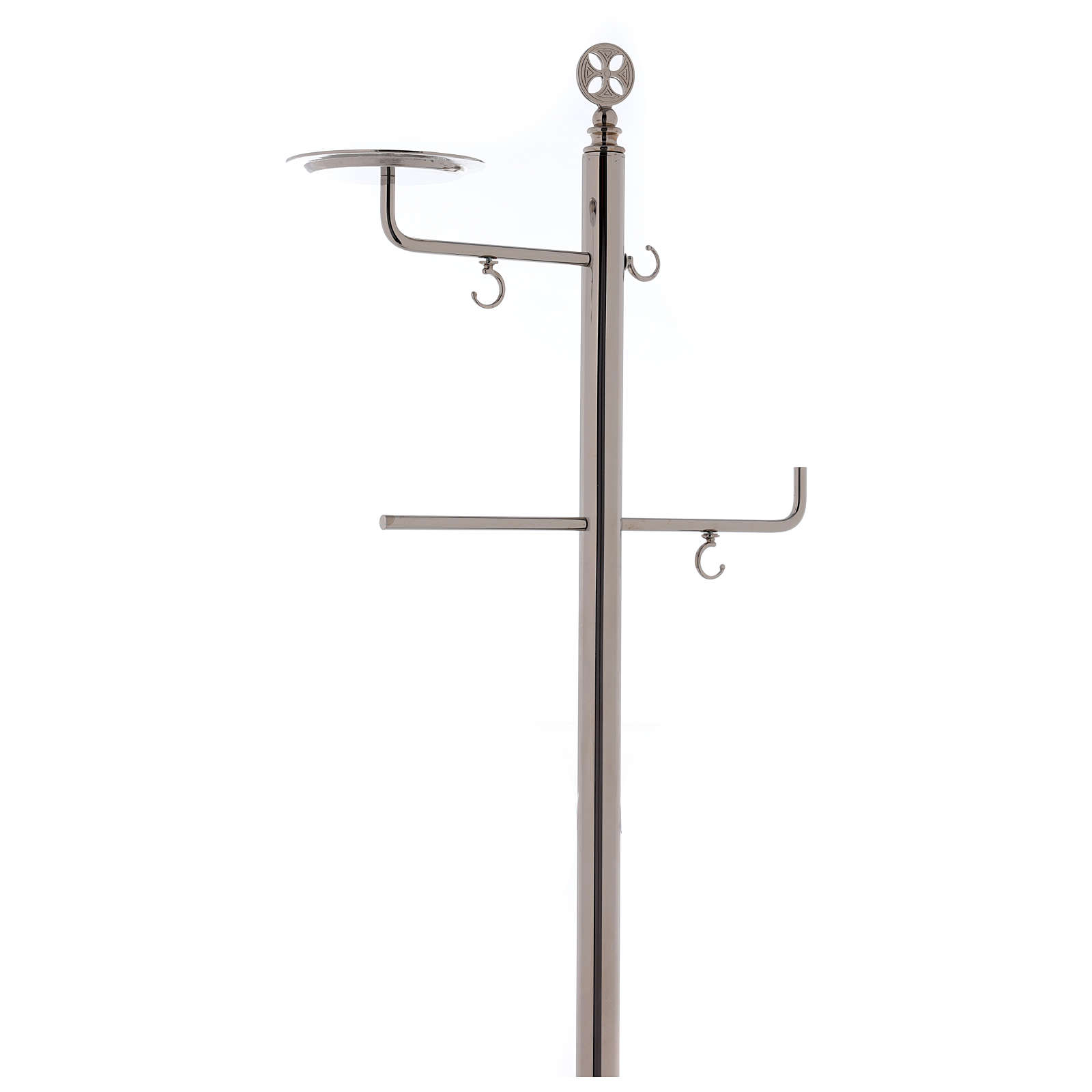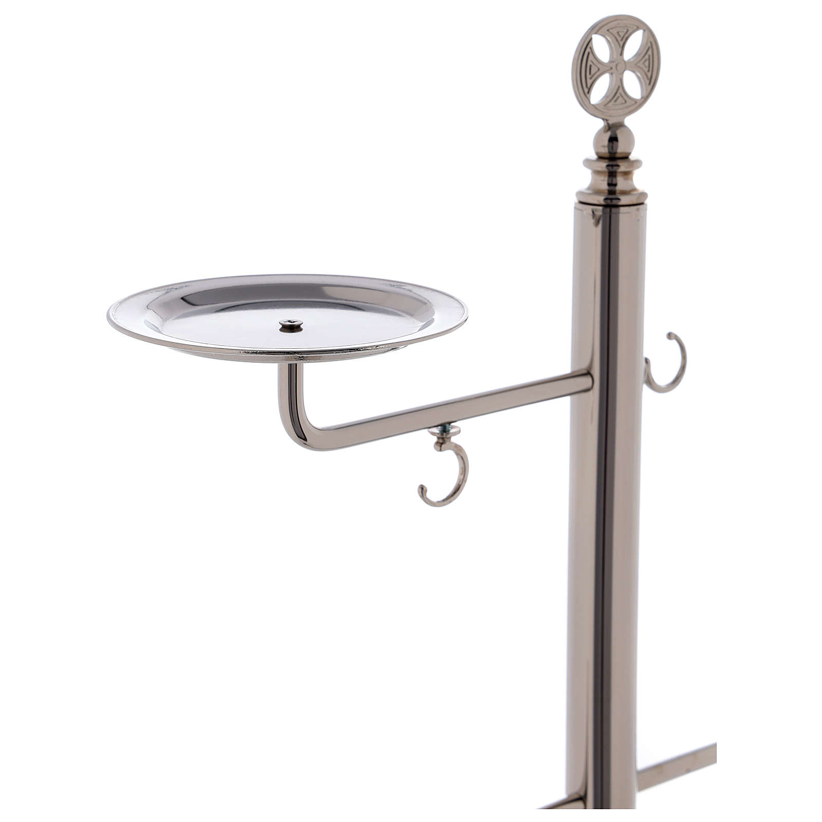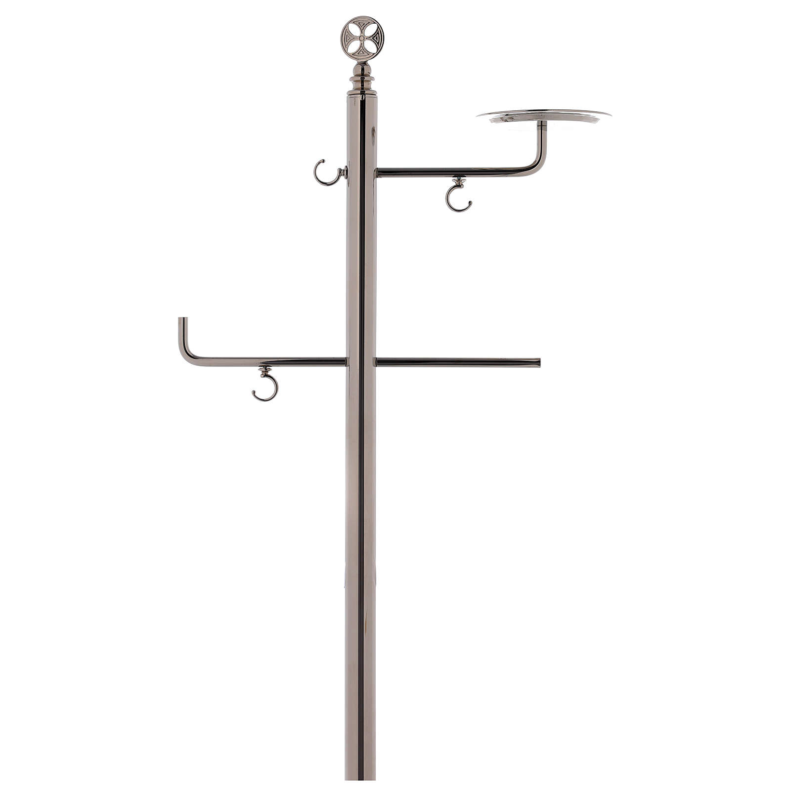 Questo elegante portaturibolo presenta un braccio con ganci per appendere agevolmente il turibolo e un braccio con piattino per navetta portaincenso. L'asta principale è decorata alla sua sommità con una croce tonda.