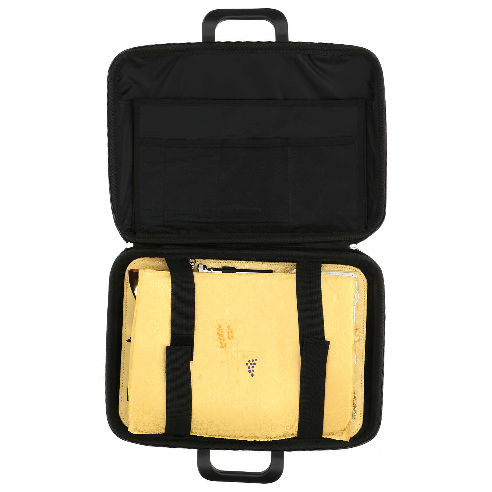 La borsa esteriormente è realizzata in ecopelle, all'interno è presente un pannello porta oggetti in jacquard giallo che contiene: aspergens, calice in ottone dorato 24k, piattino, vasetto per Oli Santi, scatola, bottigliette da 30ml per acqua e vino, porta ostie, altare in fusione con supporto per croce e candele, croce pastorale, candele in cera, set tovaglietta con croce color oro ricamata e una stoletta.