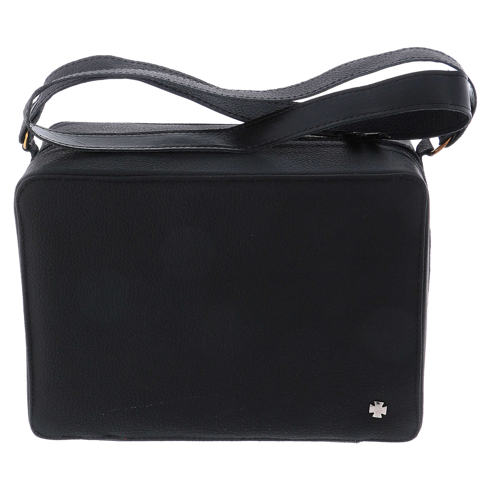 Borsa di pelle con annessa tracolla e con fodera di stoffa rossa con kit per messa e celebrazioni.