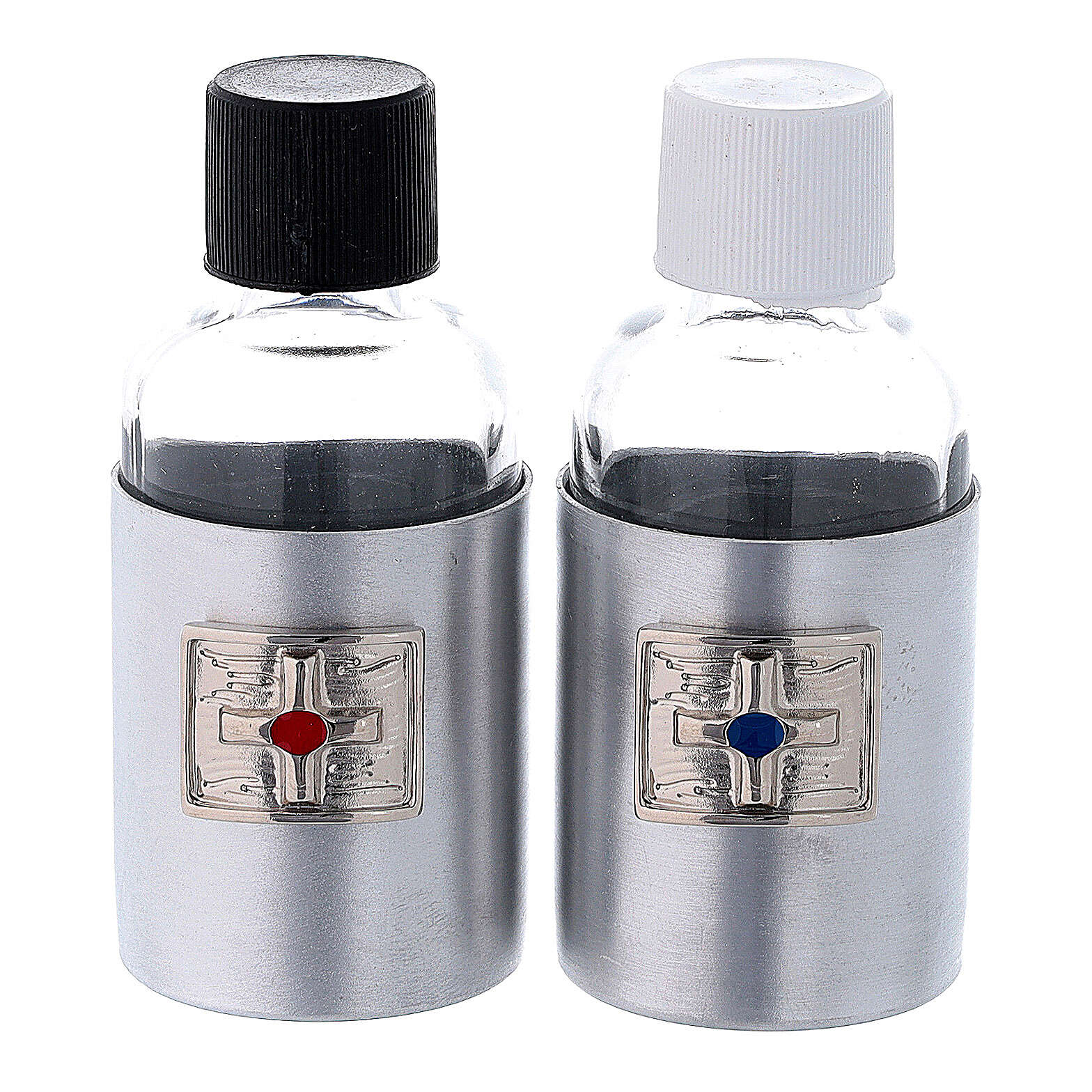 L'interno del borsello è foderato in jacquard blu e contiene: calice in ottone dorato con base martella, scatola per particole in ottone dorato con incisione IHS, piattino, stoletta, set di purifichini in cotone con ricamo, bottigliette da 30ml per vino e acqua, altare con supporto in fusione per croce e candele, due candele e una croce Pastorale.
