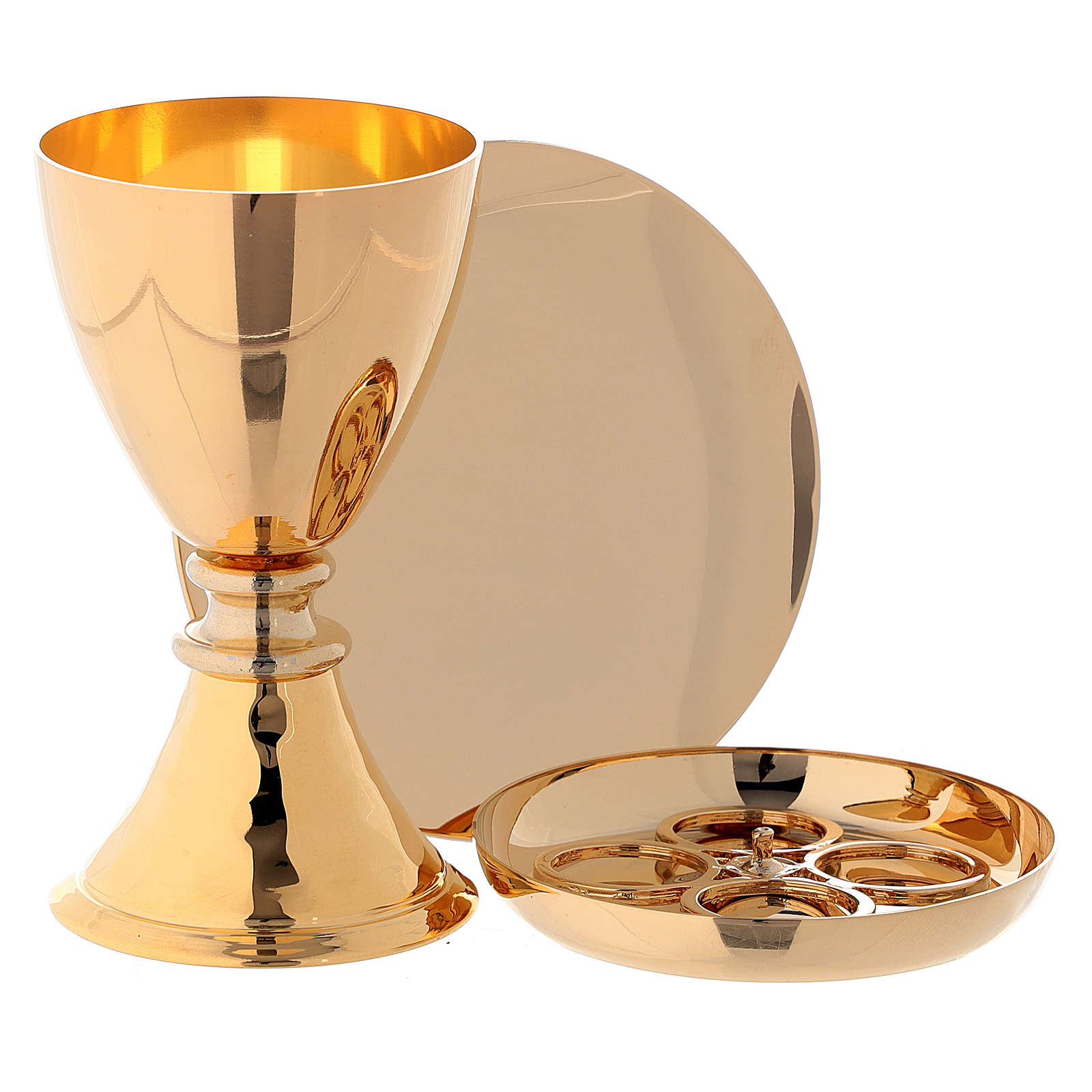 Al suo interno un pannello estraibile in raso moiré blu e decorato con motivi a spiga di grano e grappolo d'uva ospita un calicino in ottone dorato con base martellata, una scatola per particole in ottone dorato di 8 cm di diametro con placca decorativa smaltata a mano, un set di Purifichini 100% cotone con ricamo, un piattino di 10 cm di diametro, una stoletta bicolore, 2 bottiglie per acqua e vino da 30 cc, un asperges, un vasetto per oli santi, una ciotola di 8 cm di diametro con ferma particole, un altare con supporto in fusione per croce e candele, due candele in cera e una croce pastorale.