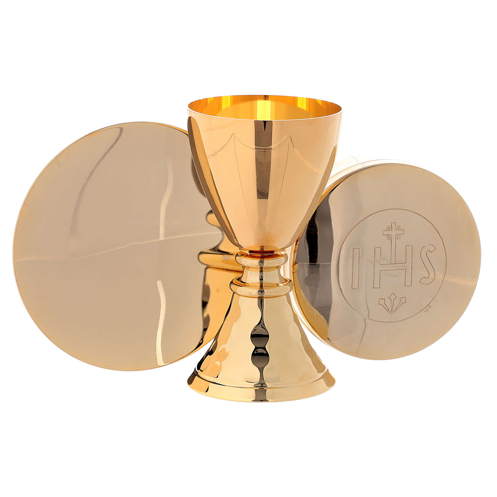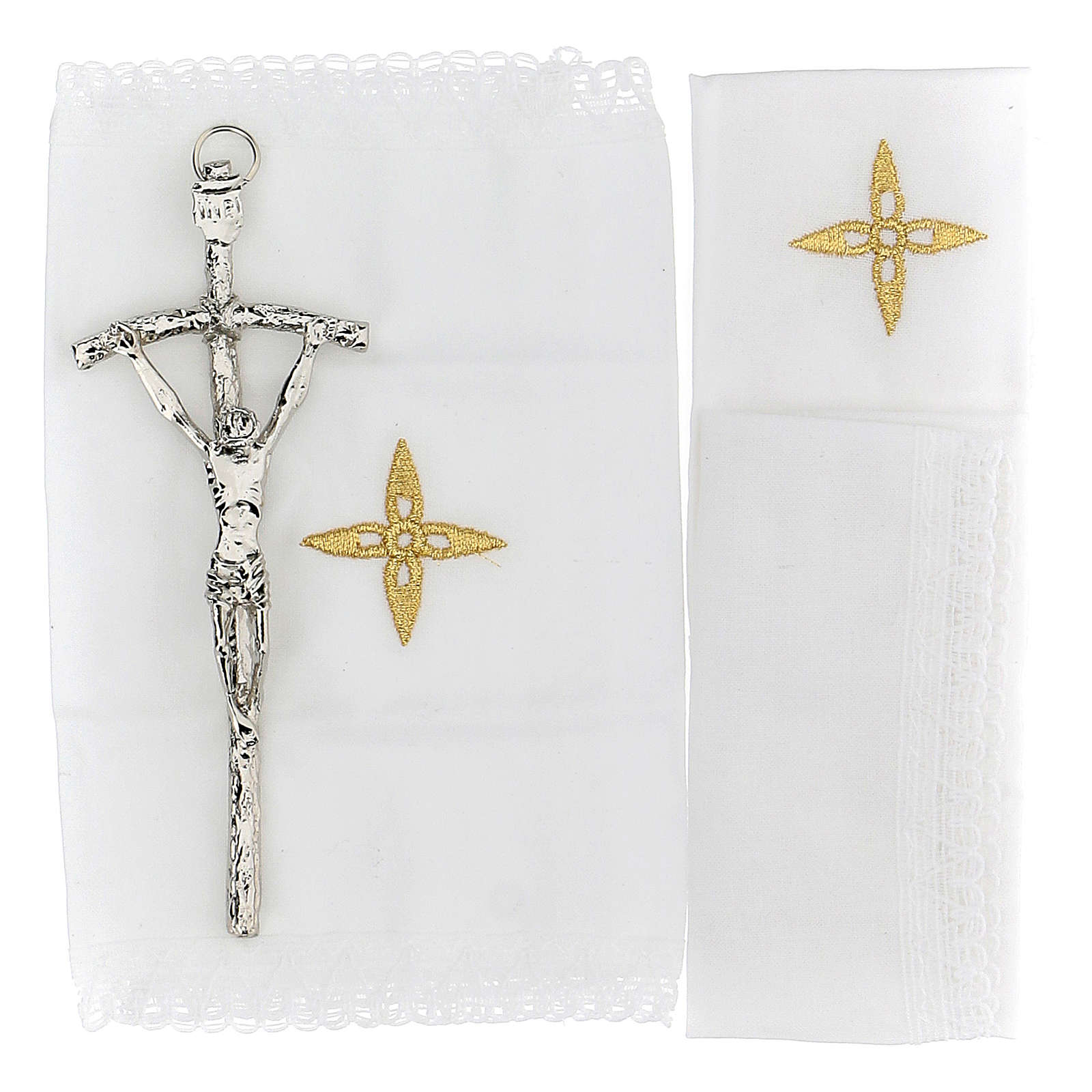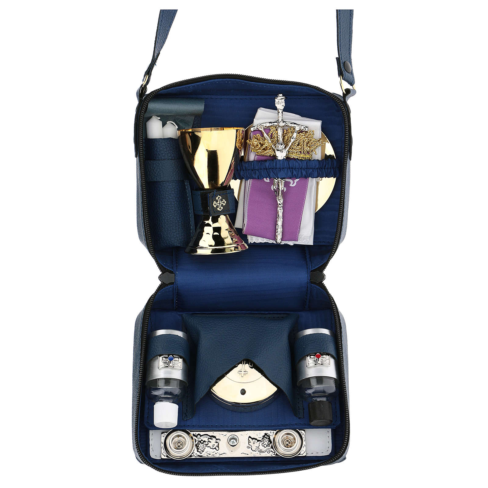 Al suo interno è completo di: calice in ottone dorato 24k con martellatura, piattino, scatola porta ostie IHS, altare in fusione con supporto per croce e candele, bottiglie Acqua e Vino 30 ml, croce pastorale e candela in cera, stoletta bicolore e set di tovaglie con croce ricamata.