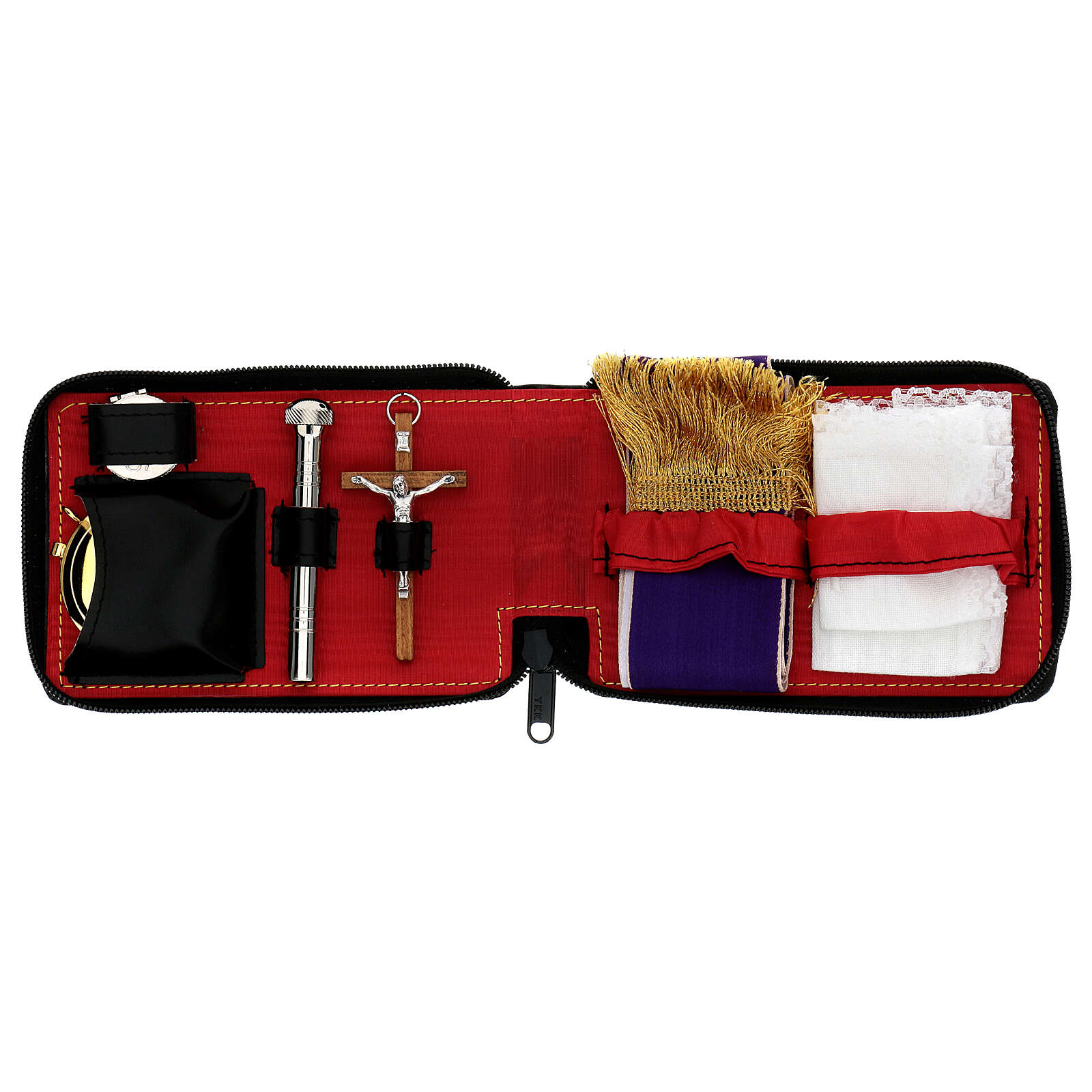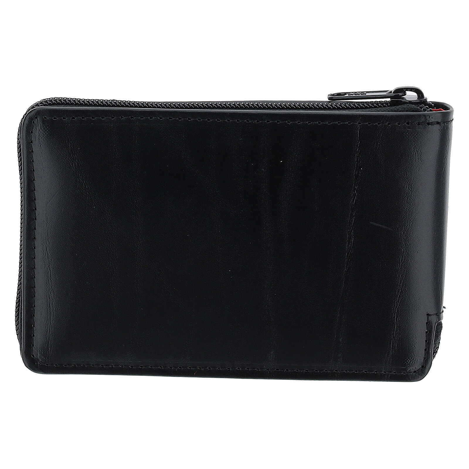 L'astuccio in vera pelle è nero all'esterno, in tessuto rosso all'interno, con un'elegante chiusura zip.