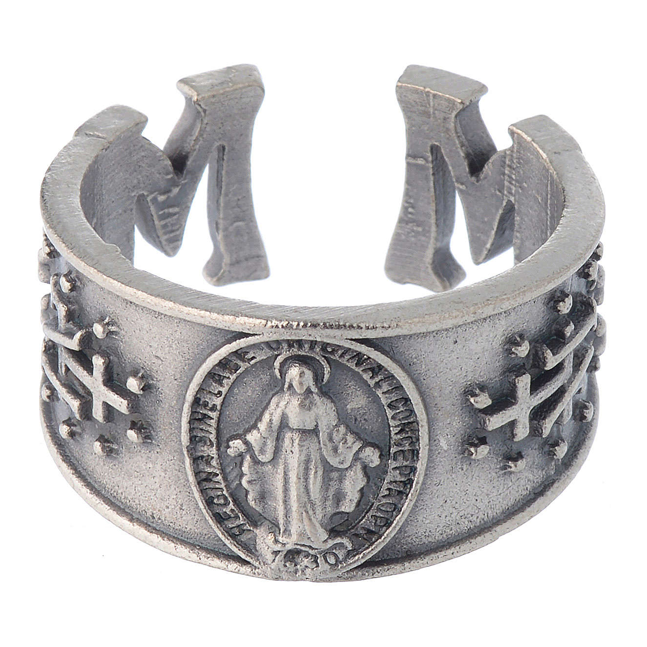 Anello brunito raffigurante la Medaglia Miracolosa coniata in seguito alle apparizioni mariane a santa Caterina Labourè e su richiesta della Madonna.