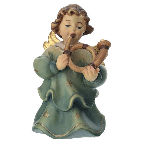 Angelo con corno: statuetta in legno di acero, intagliata e dipinta a mano da artigiani della Valgardena. L'utilizzo dei colori ad olio è finalizzata a lasciar intravedere le venature del legno scolpito.