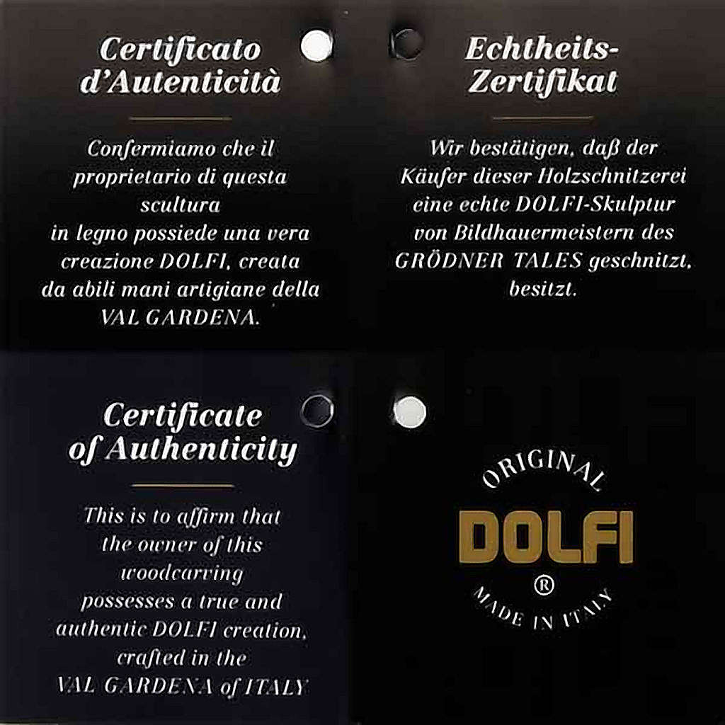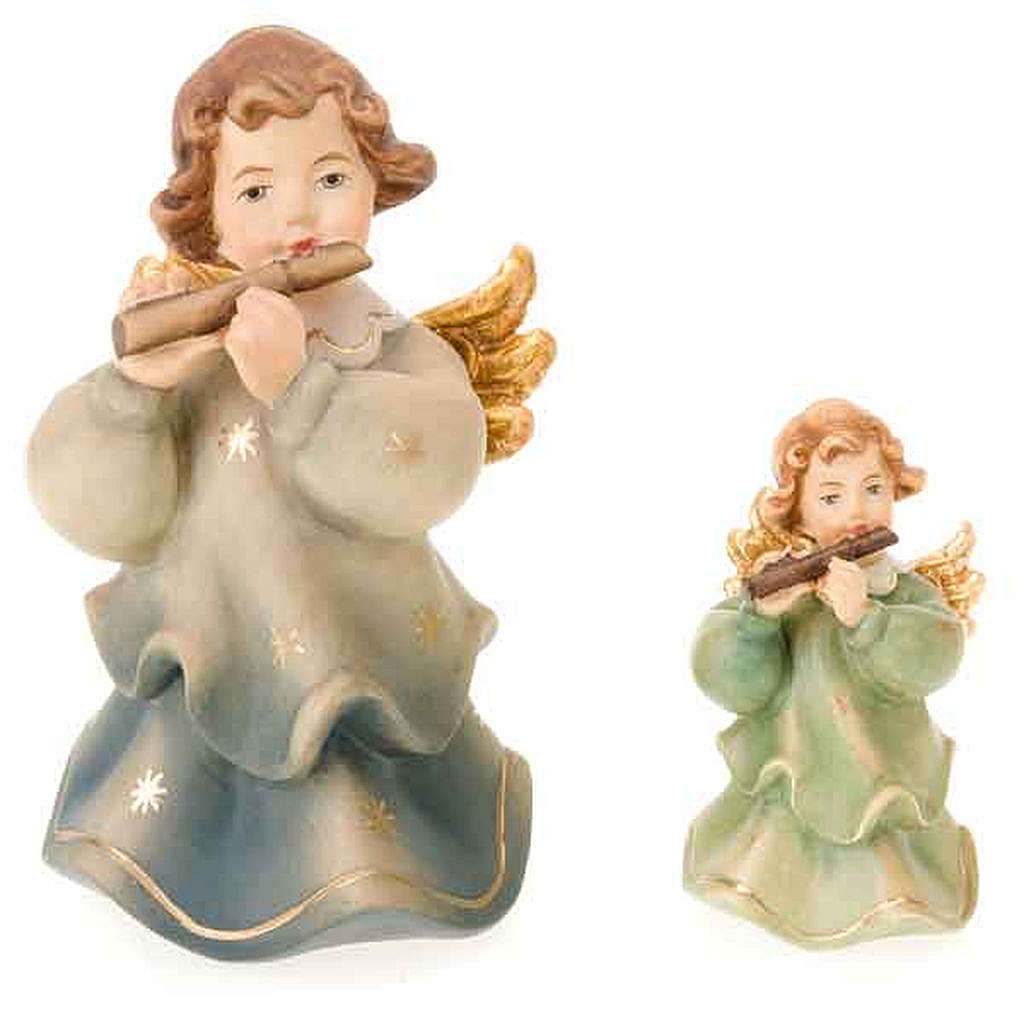 Angelo con flauto traverso: statuetta in legno di acero, intagliata e dipinta a mano da artigiani della Valgardena. L'utilizzo dei colori ad olio è finalizzata a lasciar intravedere le venature del legno scolpito.