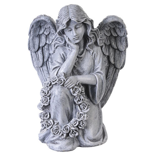 Statua decorativa angelo da esterno 30 cm in resina effetto pietra grigia con ghirlanda di fiori.