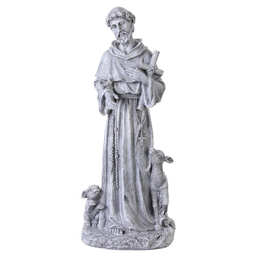 Statua decorativa in resina grigia raffigurante San Francesco.