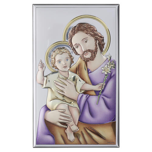 Raffigurazione a colori di San Giuseppe con Bambin Gesù con tonalità calde su vesti e incarnati e dettagli in oro e argento su elementi decorativi e aureole.