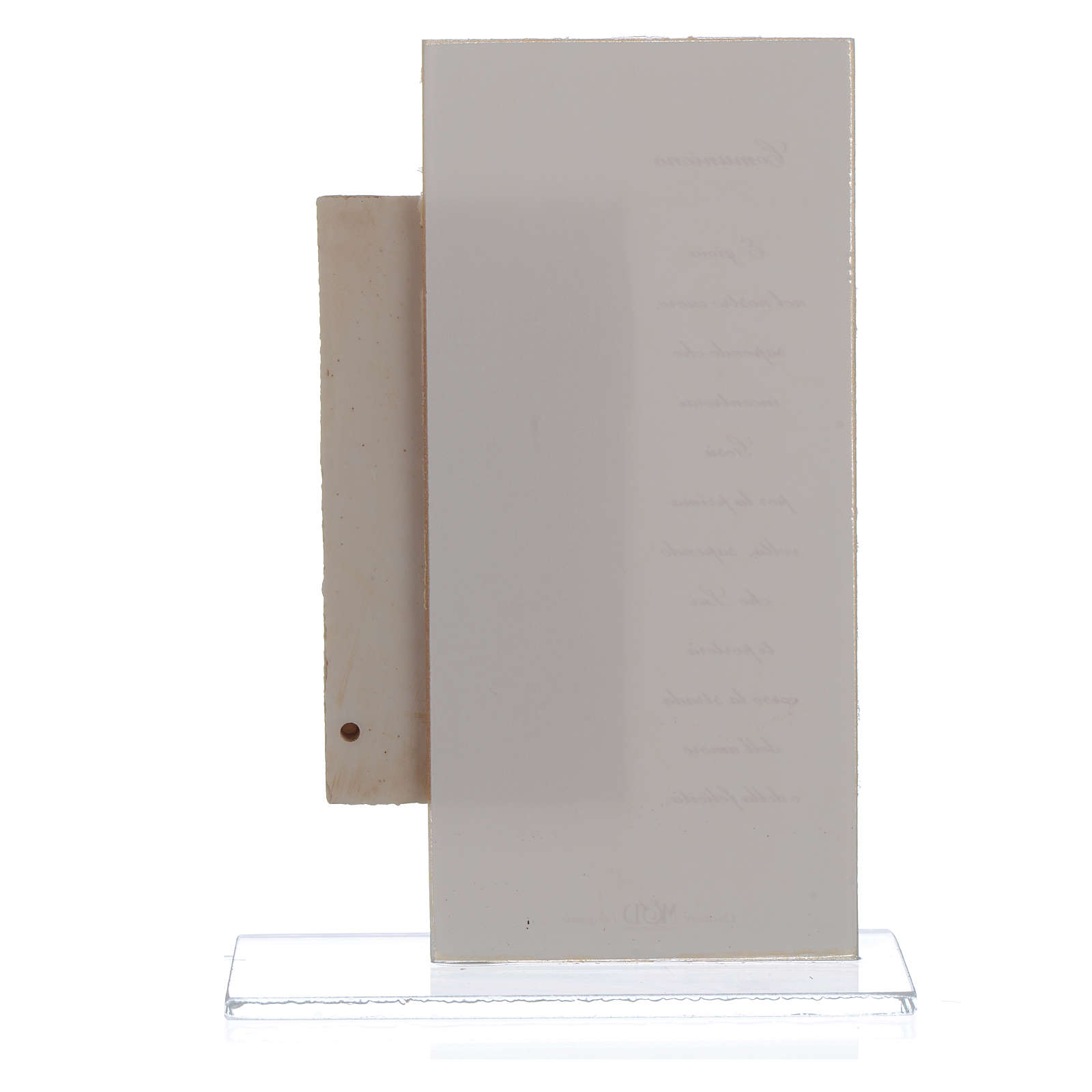 Quadretto con immagine in rilievo realizzato in polvere di marmo con preghiera stampata su vetro dal retro.
