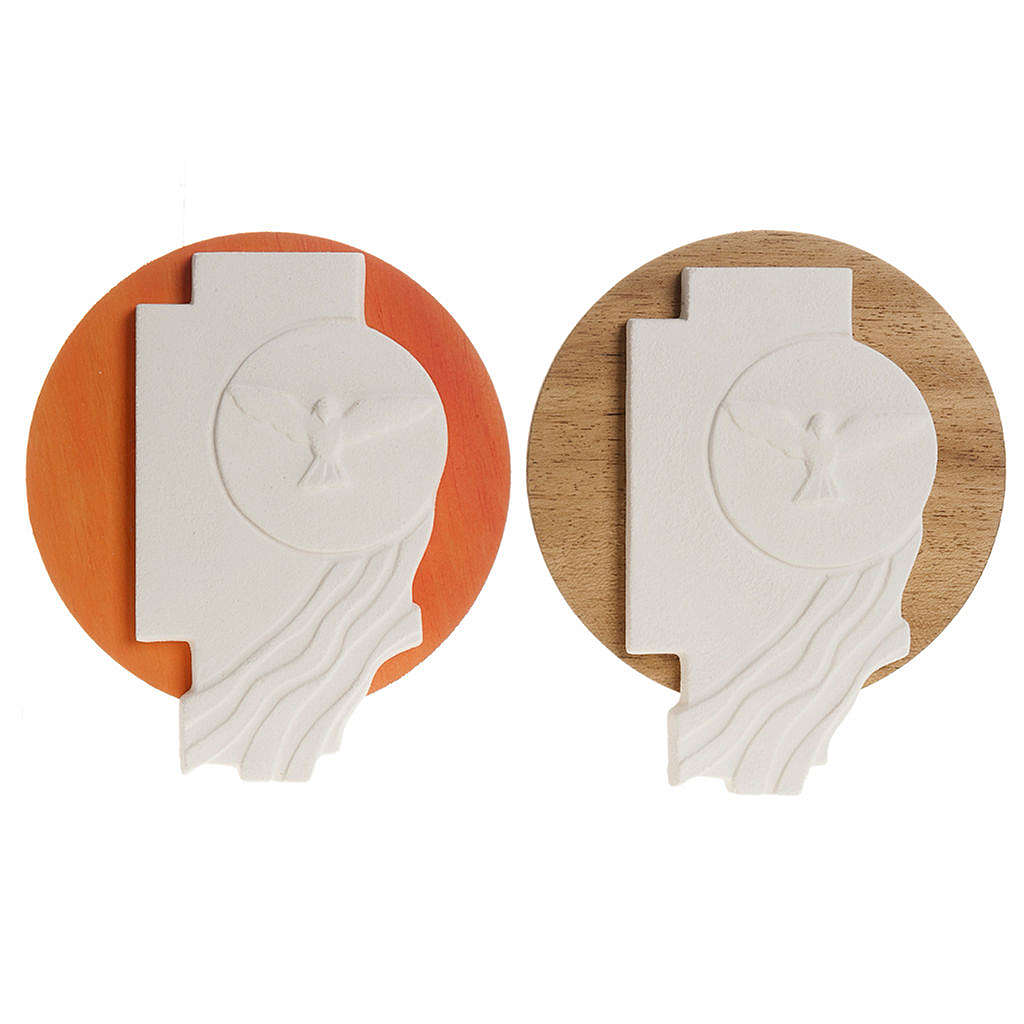 La croce è stilizzata con colomba nel cerchio appoggiata su pala di legno tonda, la croce viene cotta ad oltre 1000°C. La rifinitura e la lavorazione avviene completamente a mano, per conferirle linee gradevoli, sobrie ed eleganti.